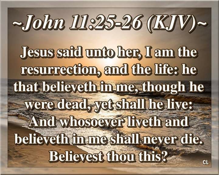 JESUS IS THE RESURRECTION AND THE LIFE: BELIEVE IN HIM AND BE SAVED FROM DEATH UNTO LIFE. TAKE HEART JOHN 11:25-26 KJV Posted on April 18, 2020 by Julia Garrison's blog Yes, I believe in Jesus and I believe His Word, Amen ❤💞💕😇 Share this: Click to share on X (Opens in new window) X Click to share on Facebook (Opens in new window) Facebook Click to share on LinkedIn (Opens in new window) LinkedIn Like Loading... Related