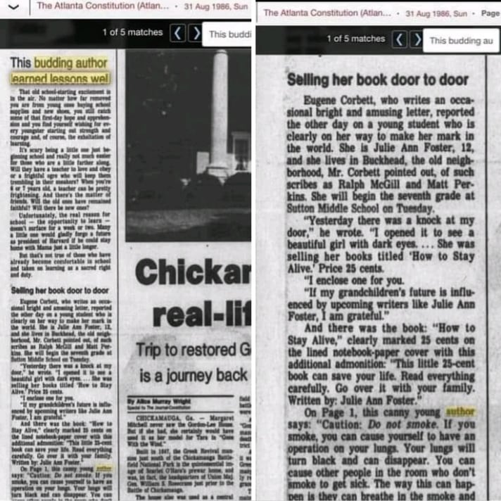 Celestine Sibley’s Column: This Budding Author Learned Lessons Well: The Atlanta-Journal Constitution Newspaper Archives of 1986 regarding my first book that was published at the age of twelve in this newspaper article in Celestine Sibley’s column. She was a well-known journalist and published author during her lifetime and wrote that she was my first and most admired reviewer. All glory and praise to our heavenly Father in the name of Christ Jesus, Amen!